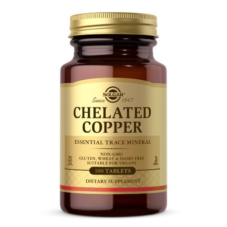 Produkt Solgar Chelated Copper miedź 100 tabl. Solgar to suplement diety. Nie może być stosowany jako substytut zróżnicowanej diety. Pamiętaj o zrównoważonym sposobie żywienia i zdrowym trybie życia.