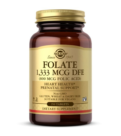 Produkt Folate 1333 mcg DFE (800 mcg Folic Acid) (250 tabl.) Solgar to suplement diety. Nie może być stosowany jako substytut zróżnicowanej diety. Pamiętaj o zrównoważonym sposobie żywienia i zdrowym trybie życia.