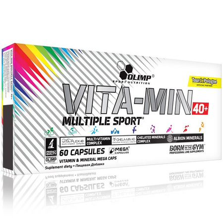 Suplement diety Olimp Vita-Min Multiple Sport 40+ to wysokiej jakości produkt, który został stworzony dla osób aktywnych fizycznie po 40 roku życia. Zawiera kompleks witamin i ekstraktów roślinnych VITA-PLEX SPORT® oraz minerałów w dobrze przyswajalnych formach - CHELA-MIN SPORT®. Preparat ten wspiera witalność całego organizmu. Jest w pełni bezpieczny, nie zawiera zbędnych dodatków.