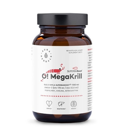 Produkt Aura Herbals O! MegaKrill 1180 mg 60 k Aura Herbals to suplement diety. Nie może być stosowany jako substytut zróżnicowanej diety. Pamiętaj o zrównoważonym sposobie żywienia i zdrowym trybie życia.