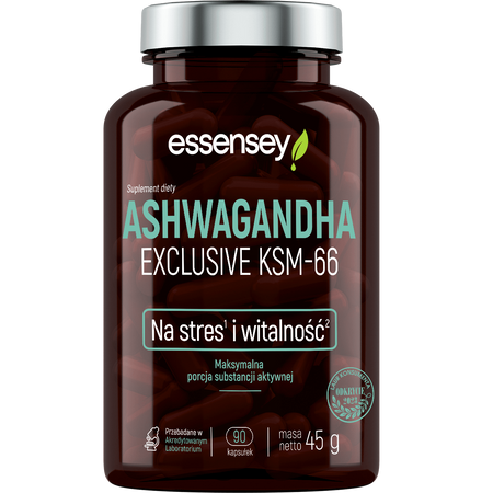 Produkt ESSENSEY ASHWAGANDHA EXCLUSIVE KSM-66 90 kap ESSENSEY to suplement diety. Nie może być stosowany jako substytut zróżnicowanej diety. Pamiętaj o zrównoważonym sposobie żywienia i zdrowym trybie życia.