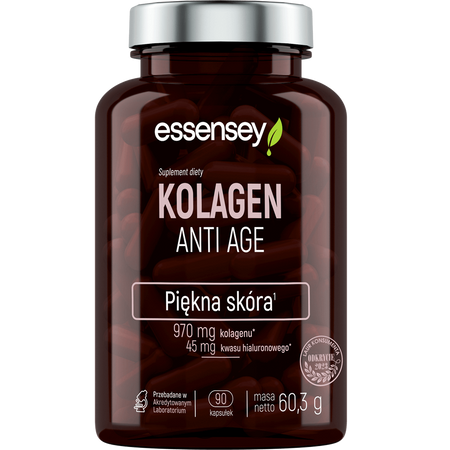 • Essensey Kolagen Anti Age to wybór dla osób pragnących zadbać o młody i zdrowy wygląd skóry. Dzięki połączeniu hydrolizatu kolagenu, witaminy C i kwasu hialuronowego skutecznie wspiera redukcję zmarszczek, poprawia jędrność skóry.