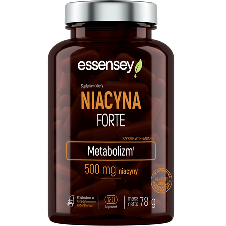 - ESSENSEY Niacyna Forte to suplement diety, który wspiera zdrowie skóry, układu nerwowego oraz metabolizm energetyczny. Dzięki wysokiej dawce niacyny w jednej kapsułce jest to idealny wybór dla osób dbających o swoje zdrowie i witalność.
