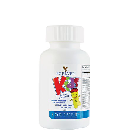 - Forever Kids Multiwitamina to suplement diety, stworzony specjalnie dla dzieci od 4 roku życia. Zawiera mnóstwo minerałów i witamin oraz dodatki warzyw i owoców, dzięki czemu dostarcza niezbędne dla prawidłowego rozwoju makro- i mikroelementy.