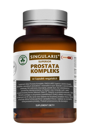 Suplement diety Singularis Prostata kompleks to wysokiej jakości produkt, stanowiący połączenie unikalnych minerałów i ekstraktów, dedykowany dla mężczyzn, szczególnie po 45. roku życia. Zawiera między innymi: ekstrakt z owoców palmy sabałowej, liści pokrzywy zwyczajnej, pestek dyni, liści wierzbownicy, pomidorów (standaryzowany na likopen) oraz cynk i selen w formie Selenium Select®. Ma postać wegańskich kapsułek.
