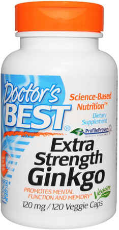 Suplement diety Doctor’s Best Extra Strength Ginkgo 120 mg zawiera najwyższej jakości standaryzowany ekstrakt z liści Ginkgo biloba. Każda kapsułka zawiera minimum 24% glikozydów flawonowych i 6% laktonów terpenowych. Jest to jedna z najwyższych ilości substancji czynnych w tego typu preparatach. Produkt jest całkowicie naturalny, nie zawiera żadnych sztucznych dodatków czy barwników. Jest odpowiedni zarówno dla wegetarian, jak i wegan.